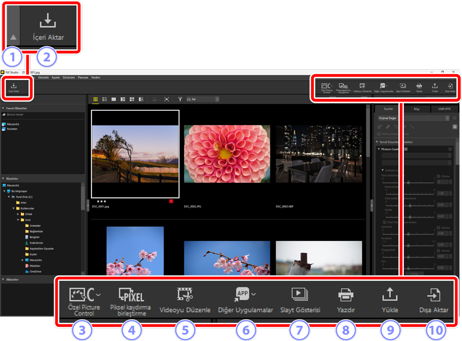 - [Değişiklikler içermeyen (ayarlamalar uygulanmamış) orijinal görüntü dosyasını açın]: Dosyalar orijinal formatlarında açılacaktır. NX Studio’da yapılan iyileştirmeler uygulanmayacaktır.