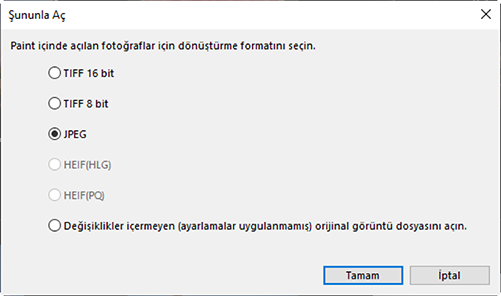 - Tercih edilen format seçilen uygulamada desteklenmiyorsa resimler açılmayacaktır.