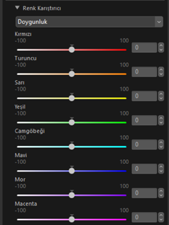 Her bir renk için doygunluğu ayarlayın. Bu, [Renk] altındaki [Doygunluk] parametresinin ayarlanması durumunda o ayarın sonucunu da yansıtır.