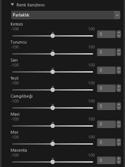 Görüntüde sekiz farklı renk için tonu ayarlayın. [Renk], [Renk Tonu], [Doygunluk] ve [Parlaklık] kanallarında ayarlamalar yapılabilir. Kullanılabilir seçenekler seçilen kanala göre değişir.
