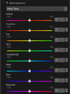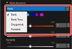 Her renk için renk tonunu ayarlayın. Bu, [Renk] altındaki [Renk Tonu] parametresinin ayarlanması durumunda o ayarın sonucunu da yansıtır.