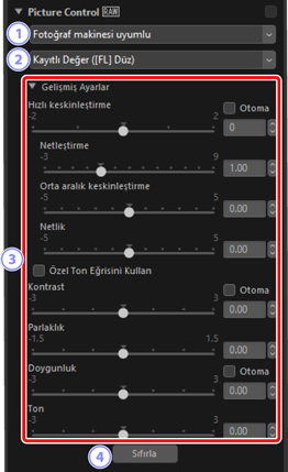 Seçilen Picture Control’de ince ayar yapmak için [Gelişmiş Ayarlar] içindeki her bir parametre için değerleri ayarlayın. Görüntülenen parametreler, en son Picture Control’ün resme uygulanıp uygulanmadığına bağlıdır.