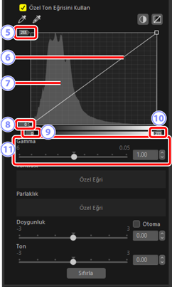 Geçerli olarak seçilen Picture Control’ün kontrast ve ton eğrilerini (parlaklık) ayarlayın. Ayarlamalar ton aralığının belirli bölgelerine yapılabilir, böylece resimler ayrıntılar gözden çıkarılmadan geliştirebilir. Bu parametreler [Otomatik] veya [Creative Picture Control] Picture Control’leri ile ya da bazı fotoğraf makineleriyle çekilen resimler için ayarlanamaz.