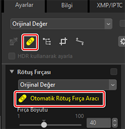 ) rötuş fırçasını etkinleştirin. Ayrıca ayarlar paletinin üst kısmındaki aracın simgesine de tıklayabilirsiniz.