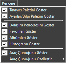- [Tarayıcı Paletini Göster]/[Ayarlar/Bilgi Paletini Göster]/[Dolaşım Penceresini Göster]/[Favorileri Göster]/[Albümleri Göster]/[Histogramı Göster]