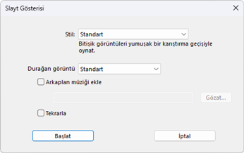 [Slayt Gösterisi] diyaloğundaki seçenekler, resimlerin ne kadar süreyle görüntüleneceğini, slaytlar arasındaki geçişleri ve diğer slayt gösterisi ayarlarını kontrol eder. Ayarları yaptıktan sonra, gösteriyi başlatmak için [Tamam] öğesine tıklayın.