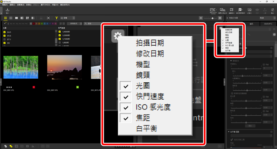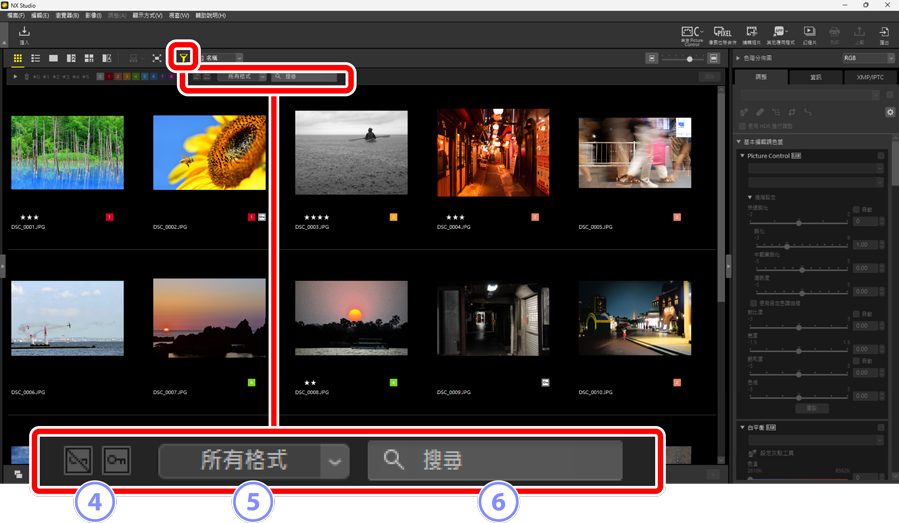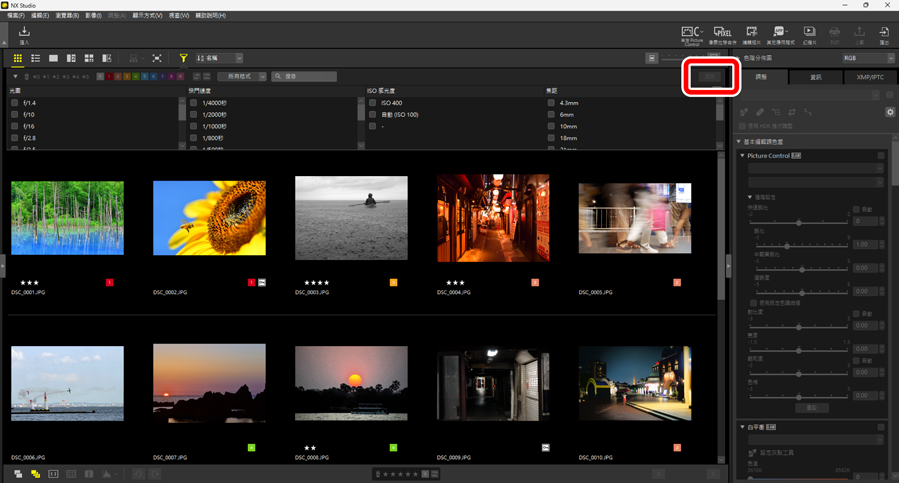 ,可按評分、標籤、保護狀態、拍攝數據或其他條件篩選照片。