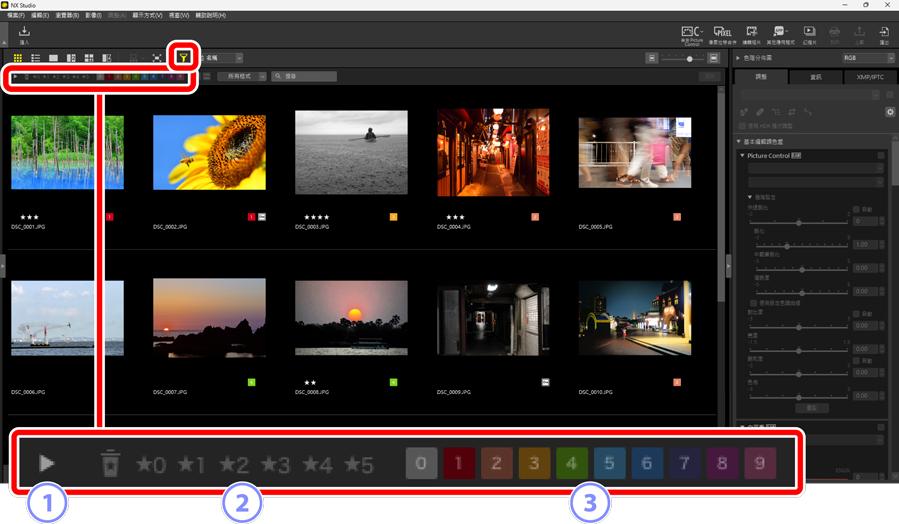 - 按評分篩選照片(0 為照片評分)。