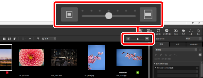 使用檢視區域右上角的按鍵為影像檢視器中的照片、“兩個/四個影像”和前後比較顯示選擇顯示大小。