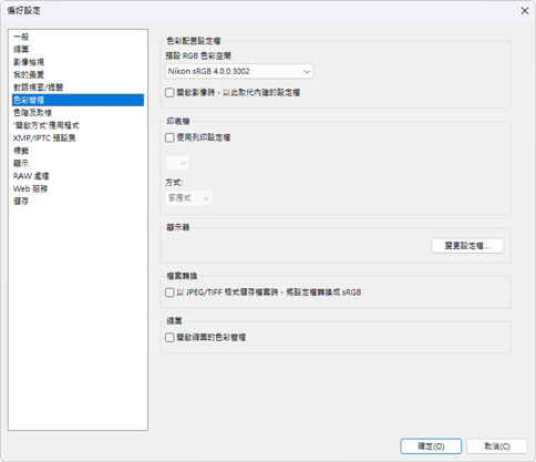 - 選擇 [以 JPEG/TIFF 格式儲存檔案時,將設定檔轉換成 sRGB] 將 sRGB 色彩配置檔案嵌入匯出時轉換為其他格式的照片。原始色彩配置檔案被重寫。
