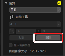 裁剪照片後,[執行] 更改為 [重設]。按一下 [重設] 可重設裁剪。