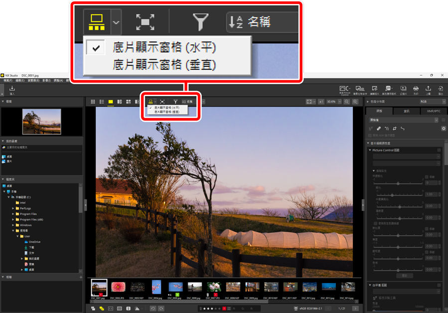 按鍵,以查看影像檢視器下方或左側檢視器、“兩個/四個影像”和前後比較顯示的一行或一列縮圖(“影片”)。
