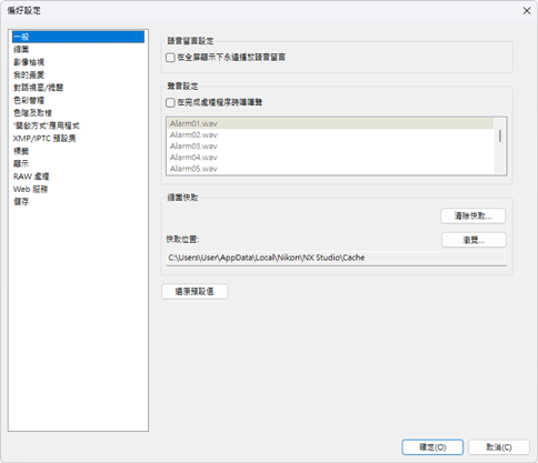 - 如果選擇 [在完成處理程序時嗶嗶聲],NX Studio 將在處理完成時發出聲音。聲音可從列表中選擇。