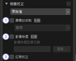 校正摩爾紋、影像感應器上的灰塵以及紅眼。當啟用 [使用 HDR 進行調整] 時不會顯示此工具。