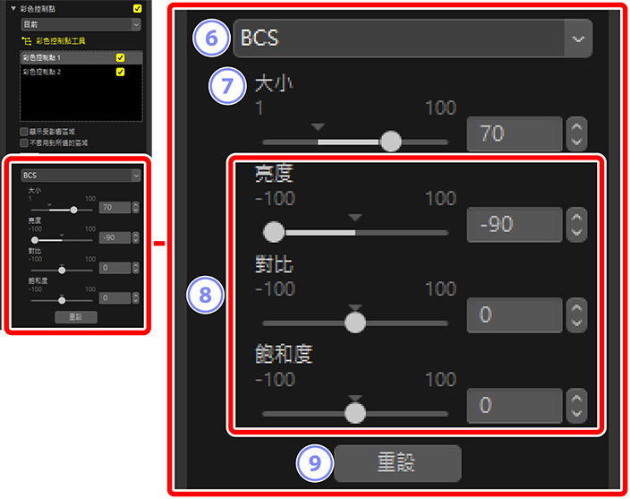 )。這些滑桿用於調整色彩和選擇調整所套用的區域。