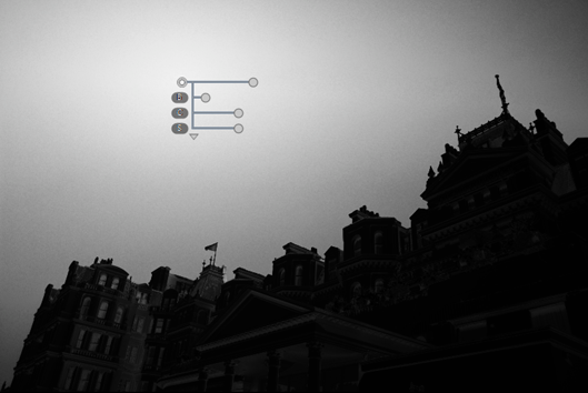 向左或向右拖曳調整滑桿的手柄以調整所選色彩。插圖顯示的是 [B](亮度)滑桿正用於調整天空的亮度。效果僅套用至天空的藍色,而建築物的色彩不受影響,且效果隨著與控制點距離的增加而減弱。