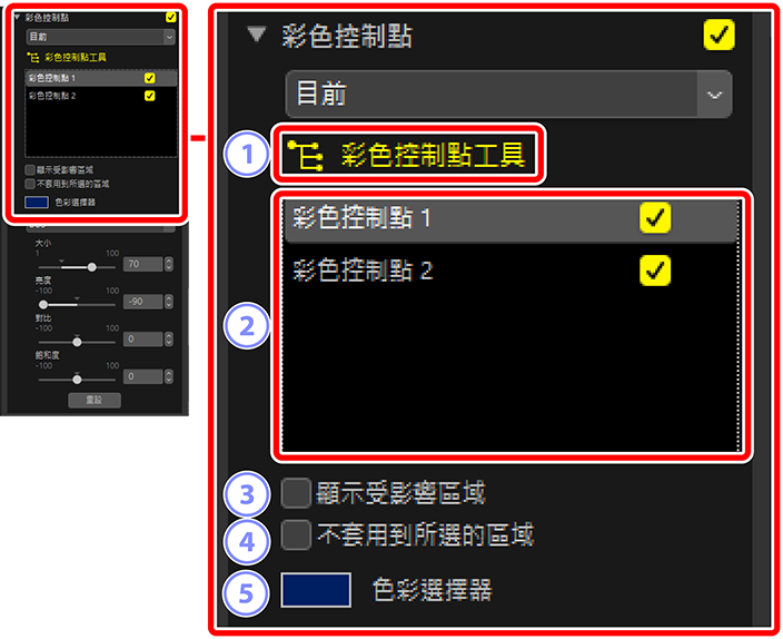 - 停用所選控制點的調整滑桿。此操作還能避免影響所選區域色彩的其他控制點發生改變。受保護區域的大小可使用大小滑桿進行調整。