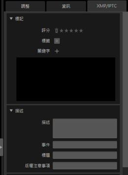 編輯 XMP/IPTC 中繼數據,包括標籤和評分。檢視區域或 [影像] 選單中標籤和評分的改變反映在 [XMP/IPTC] 標籤中。