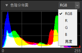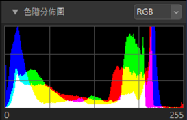 - 選擇 [RGB] 可顯示全部三個通道的色階分佈圖,[R] (紅色)、[G](綠色)和 [B] (藍色)相互重疊。色階分佈圖相互重疊的區域以其他顏色顯示。[G] 和 [B] 重疊的區域以青色顯示,[R] 和 [B] 重疊的區域以洋紅色顯示,[R] 和 [G] 重疊的區域以黃色顯示。所有通道重疊的區域以白色顯示。
