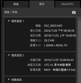- 顯示已選擇的照片的影像資訊和調整情況。