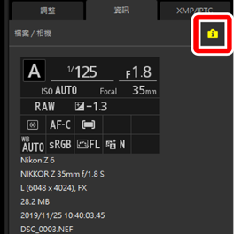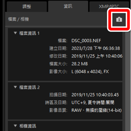 查看目前照片的資訊,包括相機型號、拍攝日期和曝光。若從相機上載至 FTP 伺服器,還會顯示照片的上載日期及時間。
