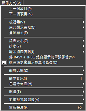 - 將以 RAW + JPEG 或 RAW + HEIF 格式拍攝的照片組合顯示為縮圖和底片顯示窗格視圖中的單張影像顯示。