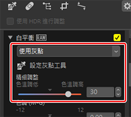 當 [使用灰點] 出現在白平衡選單中時,[色溫] 變為 [精細調整] 並且可使用滑桿對白平衡進行微調。