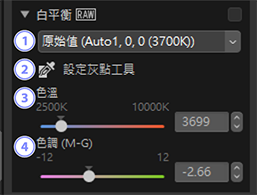 調整白平衡。請注意,該工具僅適用於 RAW 照片以及合併的像素位移照片。
