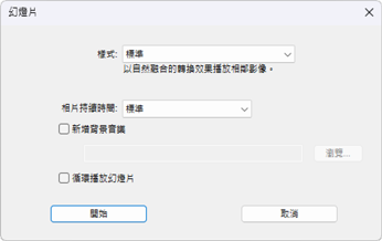 您可使用 [幻燈片] 對話窗中的選項來控制照片的顯示時間、幻燈片轉換風格及其他幻燈播放設定。調整設定後,按一下 [好],以開始幻燈播放。