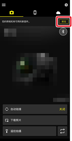 若照相机有固件更新可用,则在屏幕顶部将出现一个通知。可使用SnapBridge下载该更新并将它传送至照相机。可在此处找到支持该功能的照相机列表。可通过以下步骤下载或传送照相机固件。
