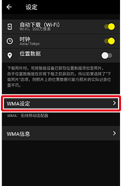 当使用SnapBridge应用程序通过Wi-Fi连接至支持Wireless Mobile Utility(WMU)的照相机时,您可以调整应用程序和无线移动适配器(WMA)的设定。