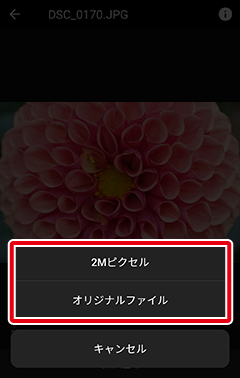 - 階調モードを設定できるカメラでHLGに設定して撮影したRAW画像は、画像のサイズを[オリジナルファイル]に設定した場合のみ転送できます。画像サイズで2Mピクセルおよび8Mピクセルを選んだ場合は転送できません。