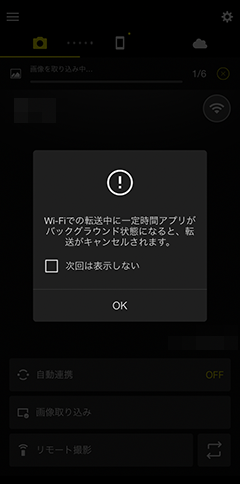 RAW画像はファイルサイズが大きいため、転送に時間がかかります。カメラで設定した画像サイズ([オリジナルファイル])で複数のRAW画像を一度に転送する場合、転送を開始する前にダイアログが表示されることがあります。[OK]をタップすると転送を開始します。