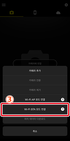 - 카메라에서 화상을 자동으로 다운로드하는 동안에는 Wi-Fi STA 모드를 사용할 수 없습니다. Wi-Fi STA 모드로 전환하기 전에 사진 다운로드가 완료될 때까지 기다리십시오.