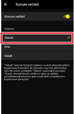 Tam konum verileri etkinleştirilmediyse konum verileri doğruluğu [Yüksek] olarak ayarlansa bile alınan konum verileri gerçek konum verileri ile eşleşmeyebilir. Yüksek doğruluğu kullanmaya ilişkin bilgiler için akıllı cihazınıza yönelik dokümanlara bakın.