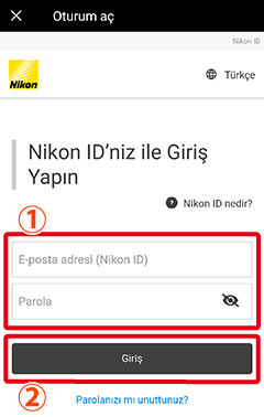 Nikon ID e-posta adresinizi ve şifrenizi girin ve [Giriş] öğesine dokunun.