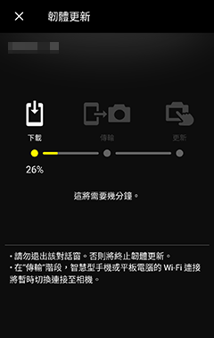 下載完成時,將提示您切換至 Wi‑Fi。輕觸 [確定] 以切換至 Wi‑Fi 並傳輸更新至相機。