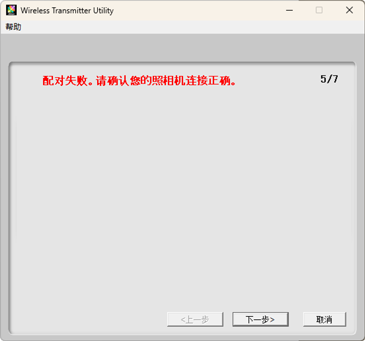 Wireless Transmitter Utility将自动为照相机和计算机配对。配对完成后,照相机和Wireless Transmitter Utility中将显示相应的信息;按下照相机上的OK按钮并在Wireless Transmitter Utility中单击下一步。
