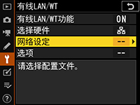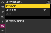 在照相机设定菜单中选择有线LAN/WT>网络设定,并按照屏幕上的指示说明创建网络配置文件。有关创建以太网配置文件的信息,请参阅照相机参考手册。有关使用WT-6的信息,请参阅照相机参考手册或WT-6的说明书。