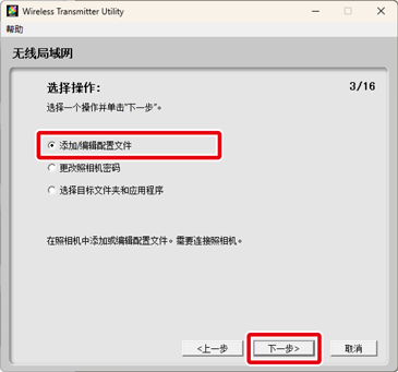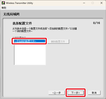 若要编辑一个现有网络配置文件,请将其选定并单击下一步。若要删除一个现有配置文件,请将其选定并单击删除配置文件。Wireless Transmitter Utility无法用于更改已使用照相机密码保护选项进行保护的配置文件。删除或修改配置文件之前,请将密码保护选为关闭。