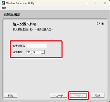 输入一个最多16个字符的配置文件名称,并从FTP上传、图像传送、照相机控制和HTTP服务器中选择一种连接类型。设定完成时单击下一步。