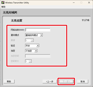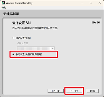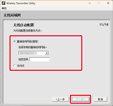 若您在步骤7中选择了自动设置(推荐),无线局域网络设定将会自动调整。选择基础结构网络(推荐)或访问点并单击下一步进入步骤10。