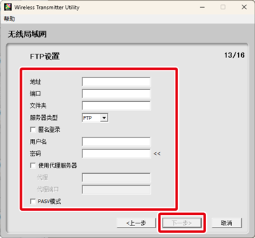 仅当在步骤6中选择了FTP上传时,FTP服务器设定才可用。若选择了其他选项,请进入步骤11。调整设定后,单击下一步。有关详细信息,请参阅下表。