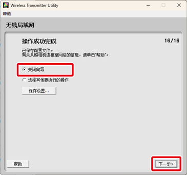 无线设定至此完成。有关从照相机连接至网络的信息,请参阅“使用在计算机上创建的配置文件进行连接”。