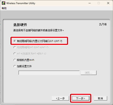 选择有线局域网络(内置以太网端口/UT-1/WT-7)并单击下一步。