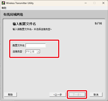 输入一个最多16个字符的配置文件名称,并从FTP上传、图像传送、照相机控制和HTTP服务器中选择一种连接类型。设定完成时单击下一步。