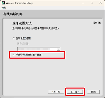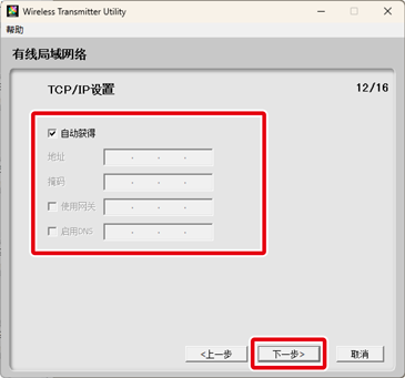 若您在步骤7中选择了自动设置(推荐),TCP/IP设定将会自动调整。进入步骤9。请注意,自动设置(推荐)在以下情况时不可用: