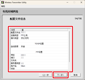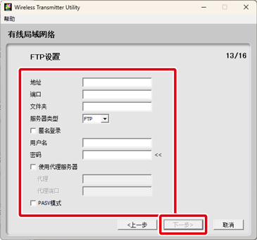 仅当在步骤6中选择了FTP上传时,FTP服务器设定才可用。若选择了其他选项,请进入步骤10。调整设定后,单击下一步。有关详细信息,请参阅下表。