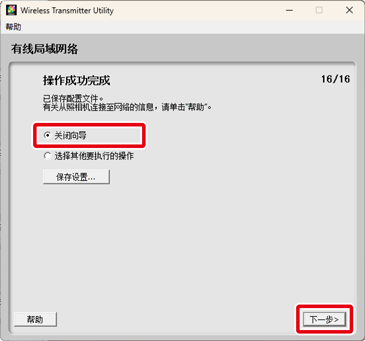 以太网(有线局域网络)设置至此完成。有关从照相机连接至网络的信息,请参阅“使用在计算机上创建的配置文件进行连接”。