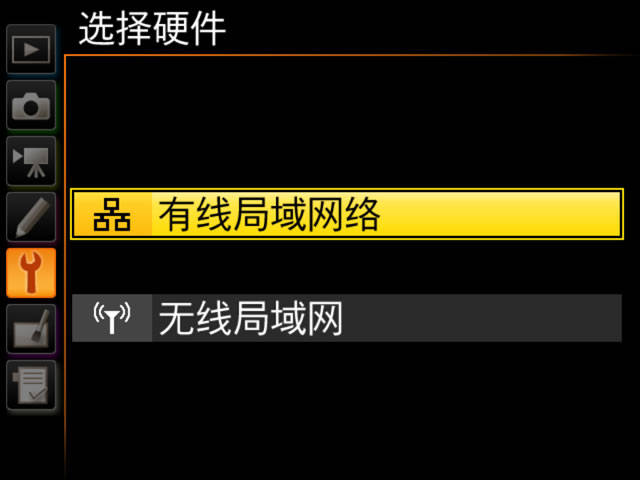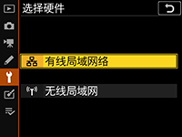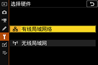 在照相机设定菜单中选择有线LAN/WT>选择硬件>有线局域网络。
